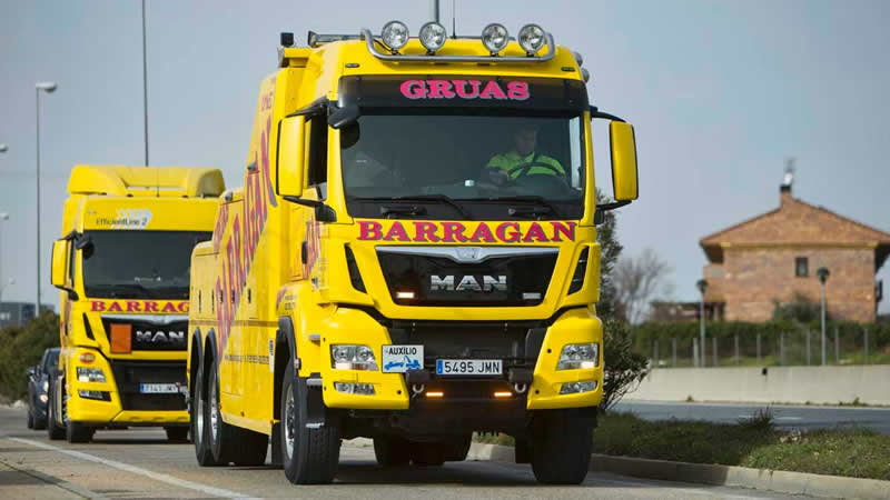 Grúas Barragán es la compañía de asistencia en carretera especializada en vehículos industriales más grande de España. Y tiene plena confianza en MAN para realizar sus operaciones. Así se demuestra la presencia del 75% de vehículos MAN en su flota, compuesta por más de un centenar de unidades. Los dos últimos integrantes en dicha flota son una grúa MAN TGS 26.480 6x4, con cabina XLX, paragolpes de acero, tracción delantera y cambio manual, y una tractora TGX 18.480 EfficientLine 2.